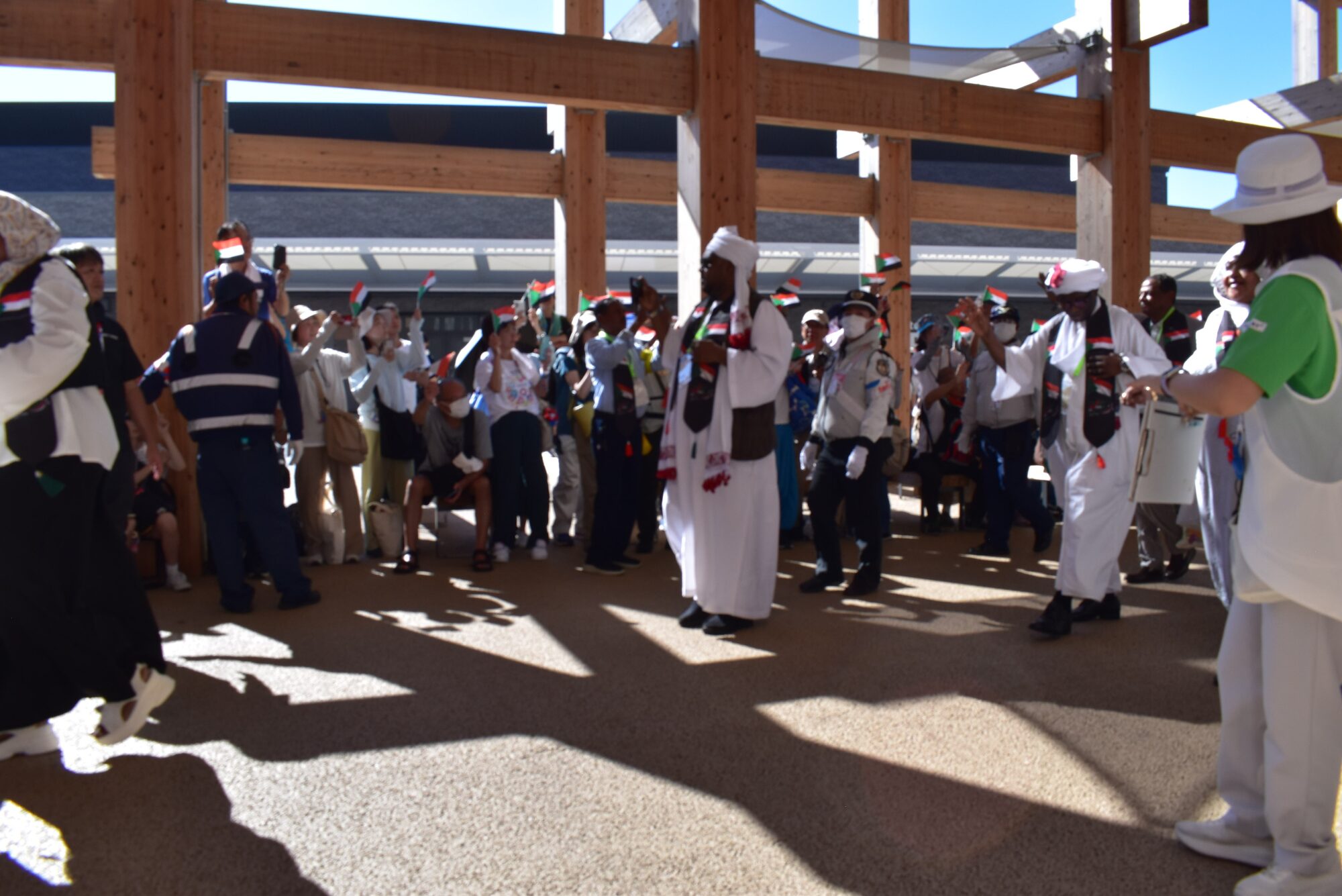集まった人たちもスーダン国旗を振りながら見送ります。