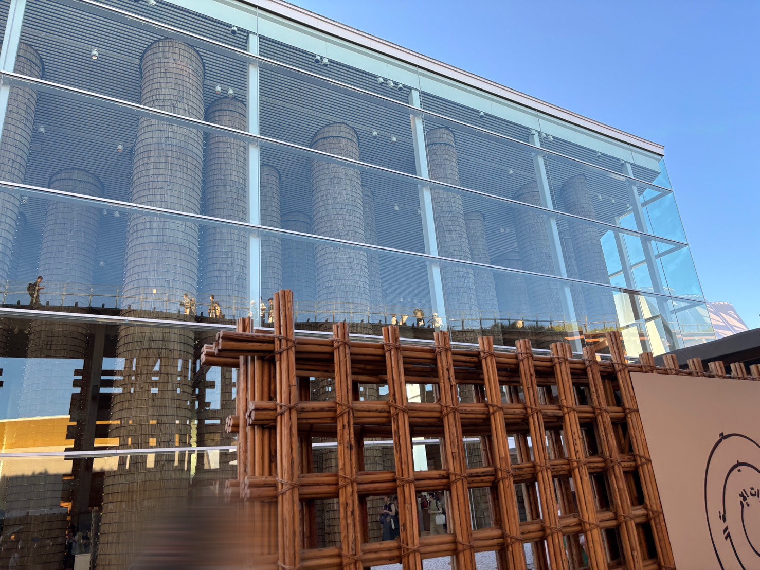 サウジアラビア館、藁の巨大な柱が乱立した内部が覗き見れる、不思議な建物です。
