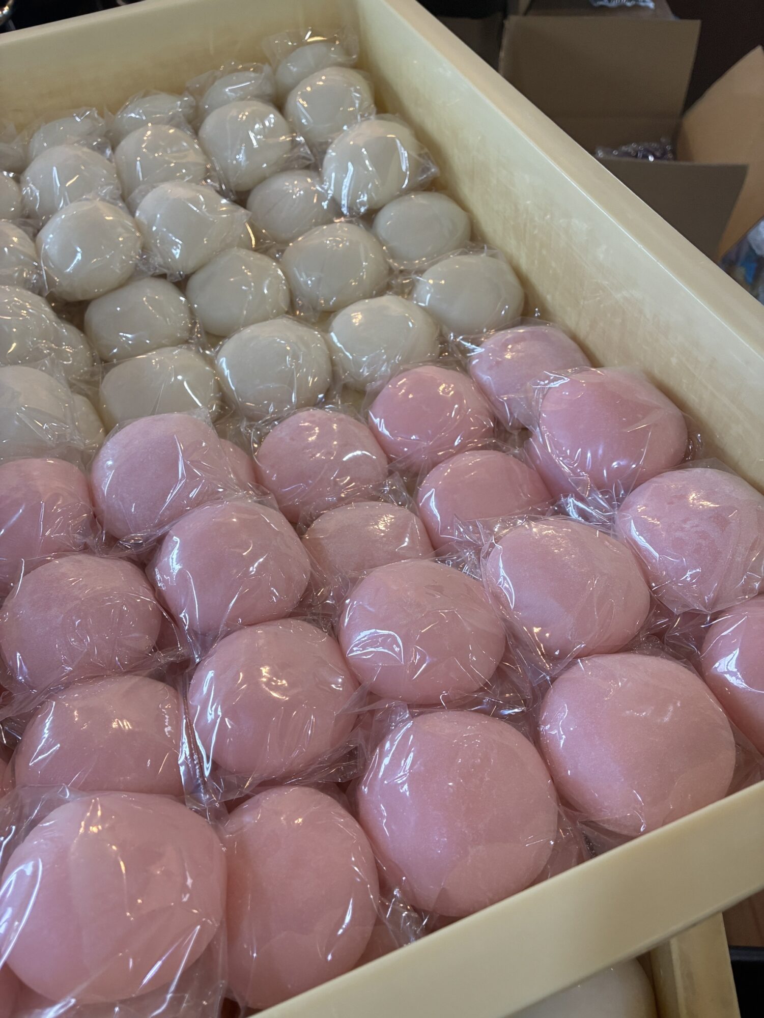 社長の「たくさん持って帰ってもらいたい」との気持ちから事前に春日井市で人気の餅彦さんのお餅を500個、角餅4個を手配。